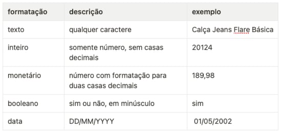 - formatações: os tipos de formatações de cada campo devem ser os indicados na coluna formatação.