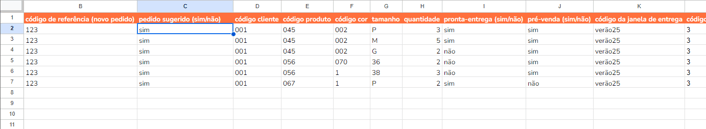 preencha a planilha com as informações necessárias para a criação do pedido e preencha como “sim” na coluna “pedido sugerido (sim/não)”.