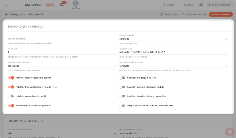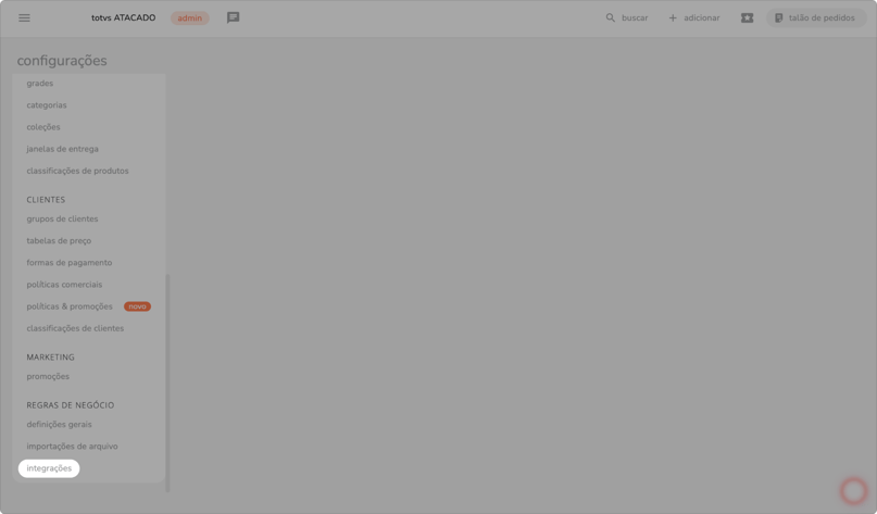 c) na tela de integrações, clique na opção do integrador totvs.
